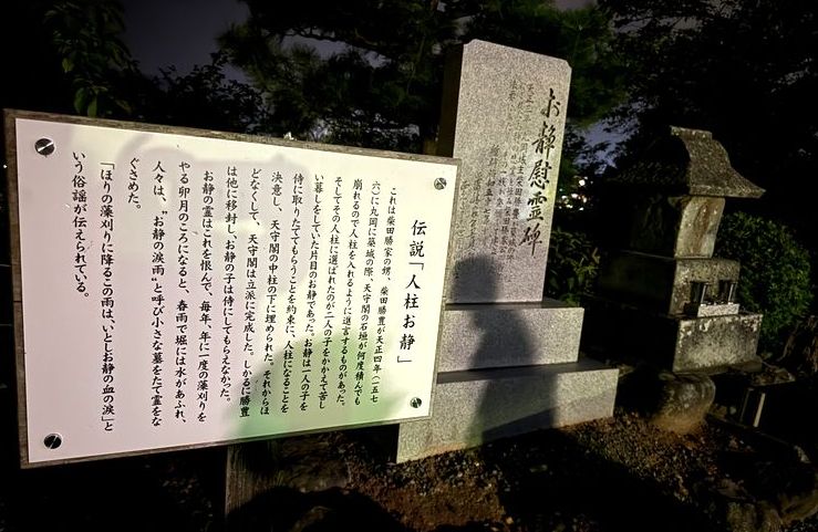 お静の悔し涙を思わせるさめざめとした雨が降っている。夜な夜な鳴き声が聞こえたのかもしれない。丸岡の春と秋の祭りには、よく雨が降るそうだが、地元の人はお静さんの・・・と思うらしい。